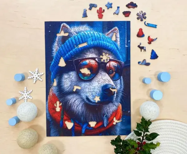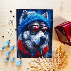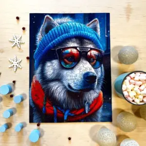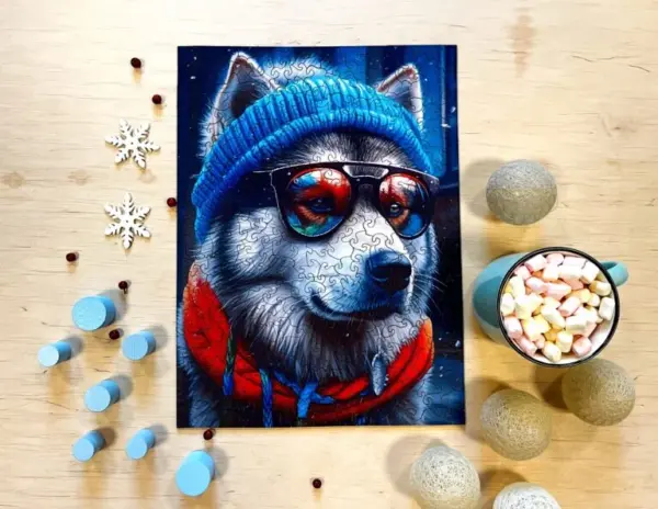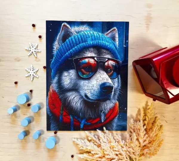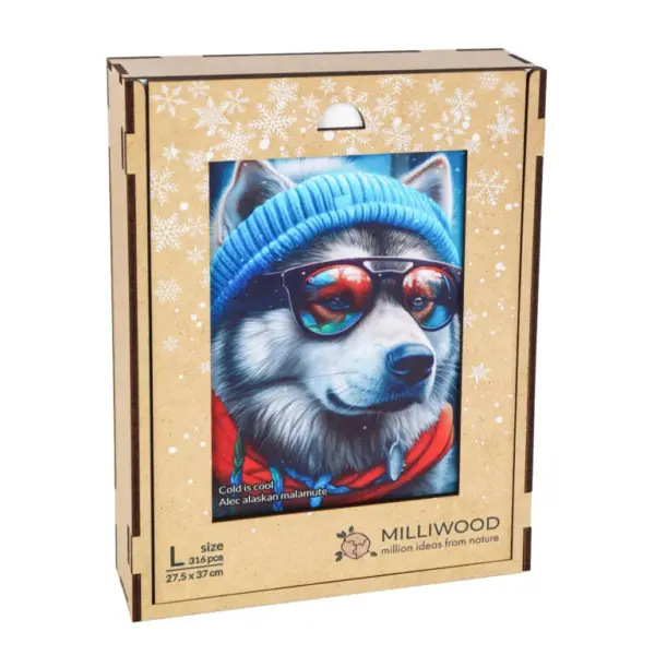 Alex nu este doar un malamut. Este un om al iernii: cu pălăria lui largă, eșarfa groasă și ochelarii de soare reflectorizanți, este un explorator, un amator de distracție și un simbol al stilului. Culorile sale sunt luminoase, profunde și vibrante - albastrul rece și albul înghețat se potrivesc perfect cu roșul, portocaliul și purpuriul.