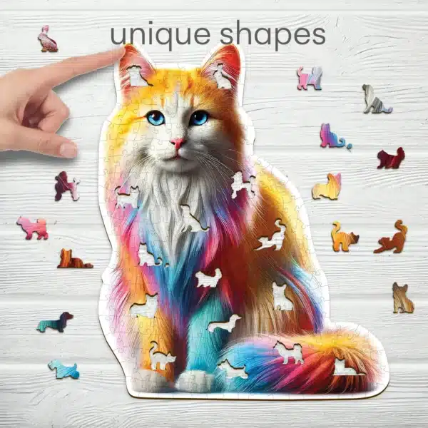 Ez a különleges fa puzzle nem csupán egy kirakós, hanem egy igazi művészi alkotás, amely örömöt, kreativitást és inspirációt hoz az otthonodba. Engedd, hogy a Álmodozó szivárványos macska barátságos tekintete és varázslatos színei elbűvöljenek, és merülj el egy különleges világban, ahol a képzelet határtalan, és minden darab egy újabb felfedezést tartogat! ✨