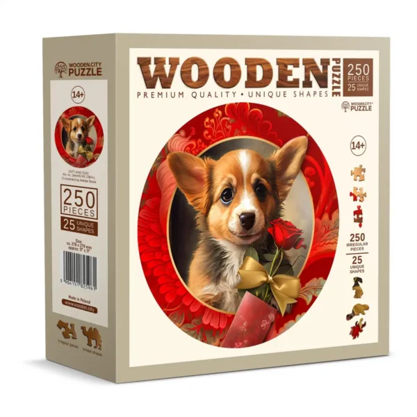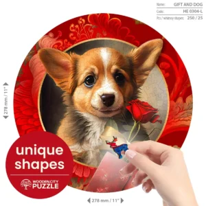 Romantic Dog Wooden Puzzle prezintă o scenă frumoasă și emoționantă: un câine, ceea ce este ca și cum ai preda un trandafiri roșii, decorată cu o fundă. Ochii ei radiază loialitate și dragoste, ca și cum ar aștepta ca cineva să accepte acest cadou mic, dar sincer. A privirea expresivă a câinelui este deosebit de atrăgătoare, pentru că ne privește cu profundă dragoste și tandrețe.