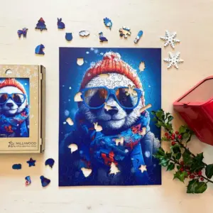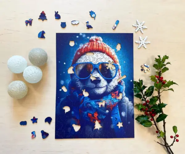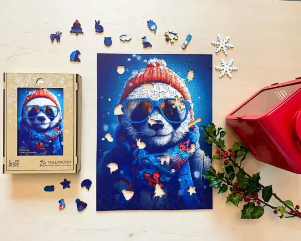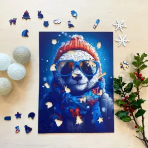 Dacă există un panda care îți va însenina ziua, acesta este cu siguranță Cezary. Acest puzzle special din lemn nu numai că te aduce mai aproape de atmosfera rece a iernii, dar dă și viață unui personaj la care nu poți să nu zâmbești. Cu ochelarii săi de soare răcoroși, pălăria tricotată și eșarfa cu modele strălucitoare, Cezary este un adevărat rege al stilului care te privește de parcă ți-ar spune: „Relaxează-te, vom trece peste această zi, doar lasă-mă!”