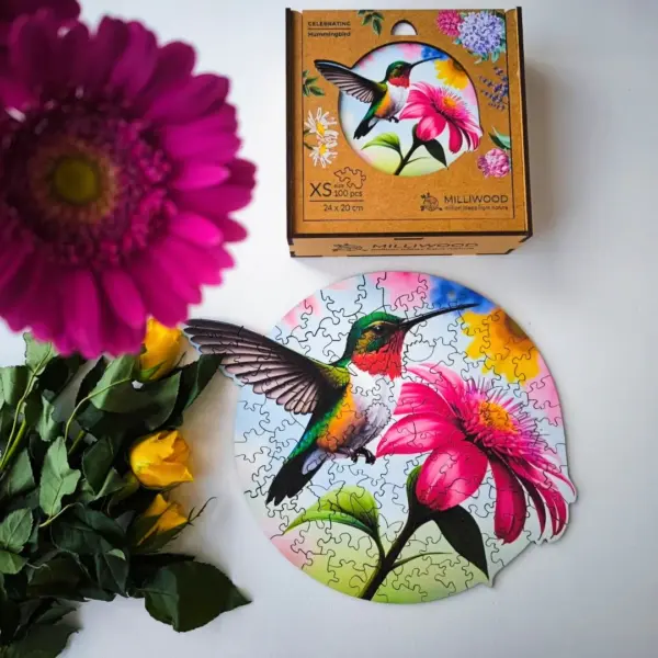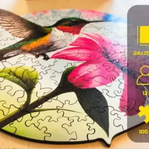 A Puzzle din lemn cu colibri este un puzzle fermecător, plin de culoare, care ușurința, bucuria și frumusețea naturii sub forma unui cadou. Întâlnirea colibriului plutitor și a florii este o amintire a magiei momentelor mici - cum chiar și cel mai mic gest poate aduce o mare bucurie. 🌸🐦