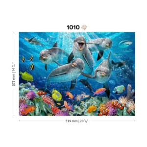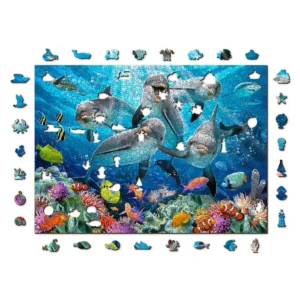 Acest puzzle din lemn vă poartă într-o călătorie subacvatică uluitoare. Într-un peisaj marin central, delfinii zâmbitori și strălucitori captează esența bucuriei în timp ce pozează pentru un selfie subacvatic plin de farmec. Ei nu sunt singuri. O multitudine de pești trec pe lângă ei, în culori strălucitoare, alături de formațiuni complexe de corali și alge marine în derivă.