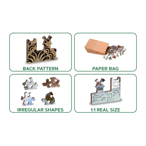 Ezek az egyedi darabok még szórakoztatóbbá teszik a puzzle összerakását, hiszen a hagyományos darabok mellett különleges formák is rejtőznek benne.