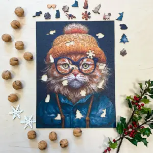 Giovanni nu este doar o pisică. Ő a pisica roșie: un adevărat gentleman care îți va fura inima cu nuanțele sale calde de blană, pălăria groasă tricotată și ochelarii distinctivi. „Giovanni the Red Cat” este un puzzle din lemn unic, bogat în detalii, care emană o atmosferă intimă și confortabilă din momentul în care ridicați prima piesă. Este ca și cum ai păși într-o țară a minunilor de iarnă fermecătoare și plină de caracter.