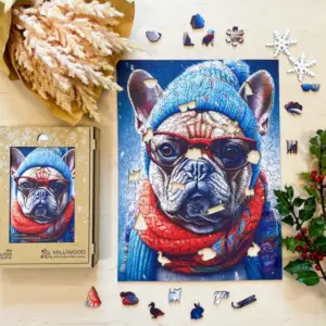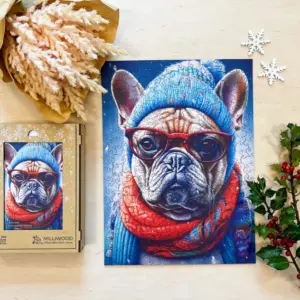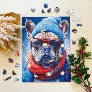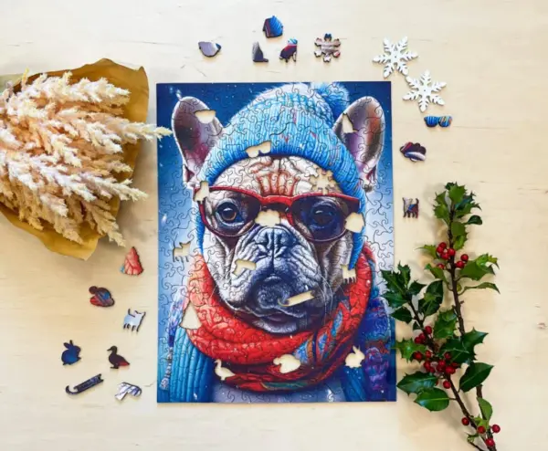 Lumea buldogilor este plină de caracter - iar Gustav îl arată din plin. Modelele bogate ale eșarfei lungi de iarnă, texturile pălăriei tricotate moi și faldurile naturale ale buldogului, toate creează o experiență distinctă atunci când sunt desfăcute. Fiecare piesă a puzzle-ului contribuie la asamblarea lentă, pas cu pas, a acestui câine carismatic, ușor morocănos, dar adorabil.