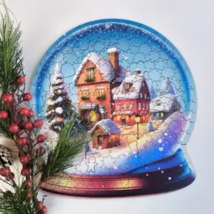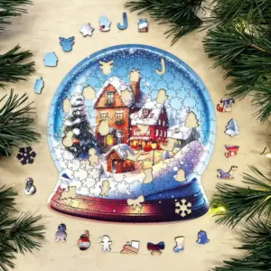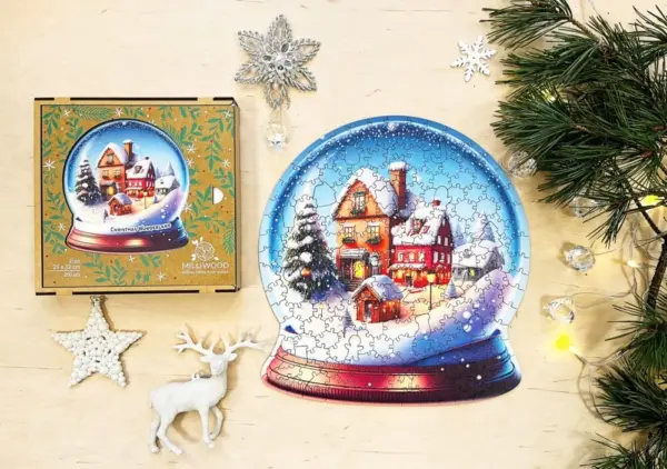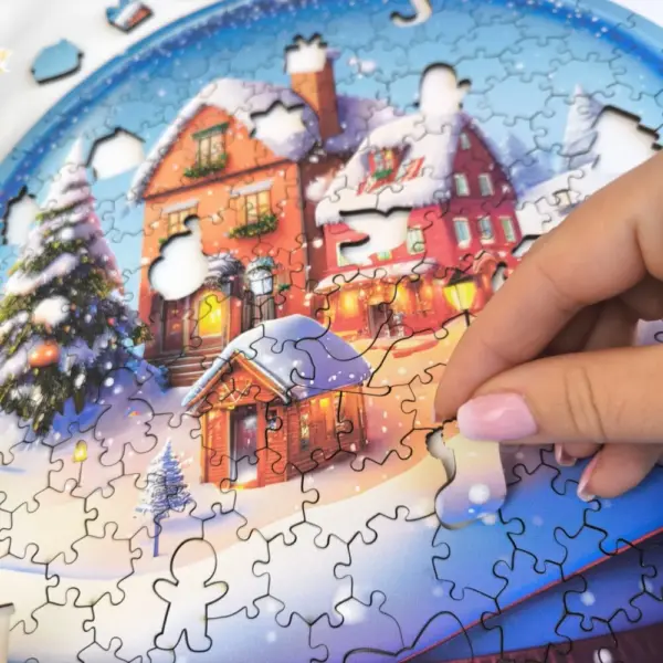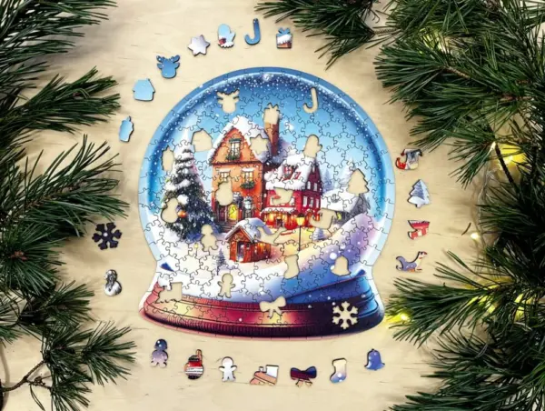 Puzzle-ul din lemn cu globul de zăpadă de Crăciun este o adevărată specialitate: oricine îl va asambla va avea o întreagă lume de iarnă în mâinile sale. Forma clasică a globului de zăpadă este intimă și iconică în sine, dar cu fulgi de zăpadă, căsuțe mici, ferestre iluminate și un sătuc care se odihnește sub o pătură de zăpadă, veți obține o ilustrație minunată, detaliată și spectaculoasă.