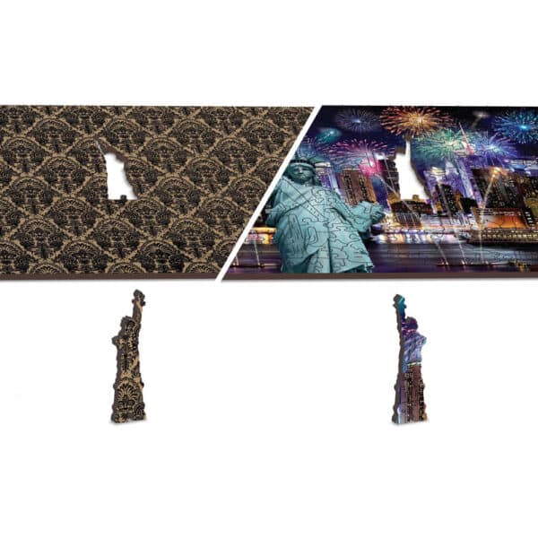 Fiecare piesă a puzzle-ului din lemn New York at night este meticulos creată pentru a recrea energia uimitoare a fotografiei. Contrastul dintre artificiile scânteietoare, luminile colorate care se reflectă pe apă și zgârie-norii care se înalță spre cer creează o atmosferă foarte specială. Aspectul impunător al Statuii Libertății contribuie la această experiență monumentală.