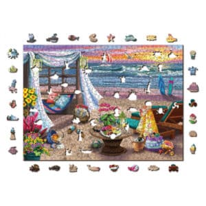 A Wooden Puzzle egy festői környezetben, a tengerparton várja a vendégeket. Képzeld el a lenyugvó napot, amely aranyszínű árnyalatot vet a nyugodt vízre, ahol egy vitorlás kecsesen sodródik. A partot, amely a homokon kanyargó tengeri madarak – pontosabban sirályok – szelíd hangjaival élénkül. A jelenet szívében egy fából készült pavilon áll, amelyben két hívogató napozóágy áll, körülötte egy véletlenszerűen elhelyezett kalap, törölközők és egy kosár. Mintha ez nem lenne elég varázslatos, egy függőágy lágyan ringatózik a szélben, pihenésre és álmodozásra hívva az embert. Az előtérben vibráló virágok pompáznak, az asztal egy tál friss gyümölcsökkel és két pohárral megterítve, romantikus szökést sugallva. Aki pedig egy kis kalandra vágyik, annak két szörfdeszka áll a parton, a következő hullámra várva.