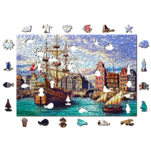 Acest puzzle este o reprezentare captivantă a navelor vechi într-un port, cu case vechi maiestuoase în fundal, un pod de piatră și apă albastră frumoasă care vă așteaptă în această piesă unică.