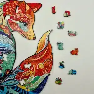 Piesele de puzzle sunt realizate din lemn de calitate superioară, astfel încât sunt atemporale și plăcute la atingere. Elementele unice tăiate cu laser conțin, de asemenea, forme speciale - animale, flori, frunze - care vă vor surprinde atunci când le veți pune împreună. Aceste mici detalii sunt cele care fac puzzle-ul cu adevărat unic, deoarece fiecare piesă spune o mică poveste în timp ce vulpea prinde viață încet în fața ochilor tăi.