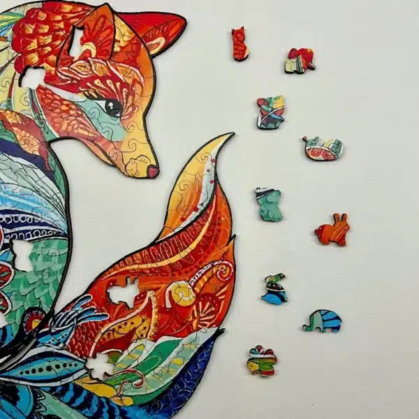 Puzzle-ul din lemn Gentle Fox surprinde frumusețea liniștită a naturii. Forma sa de vulpe, decorată cu modele florale vibrante și ondulate în culori frumoase, aduce pace și armonie în orice casă. Piesele sale speciale din lemn, inclusiv forme de animale și plante, fac experiența puzzle-ului și mai memorabilă.