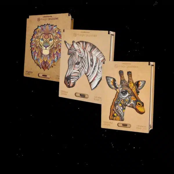 Engedd be otthonodba a szafarik lenyűgöző hangulatát! Az AZ Puzzle Szafari pachet egy exkluzív kollekció, amely három gondosan válogatott prémium fa puzzle remekművet tartalmaz. Akár magadnak keresel hosszantartó, stresszoldó, akár egy rendkívüli és környezetbarát ajándékot szeretteidnek, a Szafari csomag a tökéletes választás.