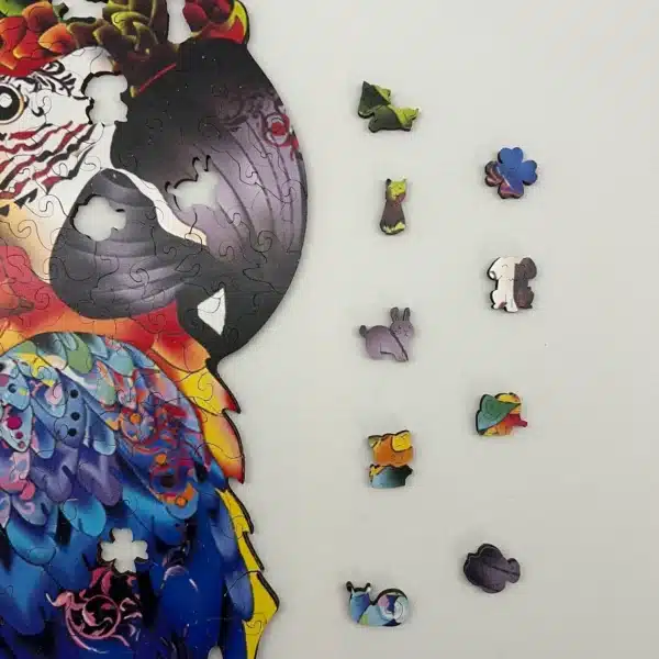 Acest puzzle din lemn nu este doar un jigsaw, ci o operă de artă. Piesele au forme unice, inclusiv figuri de animale, plante și modele imaginative. Fiecare piesă este diferită, făcând din puzzle o adevărată aventură a descoperirii. A material lemnos de calitate superioară garantează durabilitatea și, datorită tăierii precise, toate elementele se potrivesc perfect la locul lor.