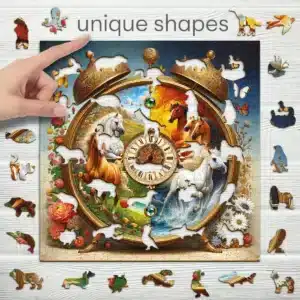De la Galopul timpului pe lemn una dintre cele mai unice caracteristici ale puzzle-ului este unicitatea pieselor. Fiecare piesă de puzzle este proiectată meticulos și are forme diferite. Animale precum pisici, pisici, pești, crabi etc. pot fi găsite printre piese și pot fi o surpriză neașteptată atunci când faceți puzzle-ul. Aceste elemente speciale nu numai că contribuie la experiența estetică, dar fac și puzzle-ul mai interesant, în timp ce potrivirea pieselor este o adevărată descoperire.