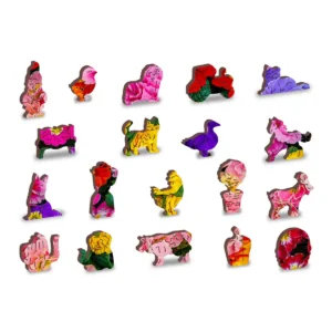 Piesele includ figurine animale, de exemplu un câine, o pisică, un cal sau un pui. De asemenea, puteți descoperi forme speciale de plante, de exemplu, flori mici sau legume care contribuie la senzația naturală a puzzle-ului.