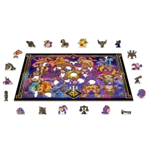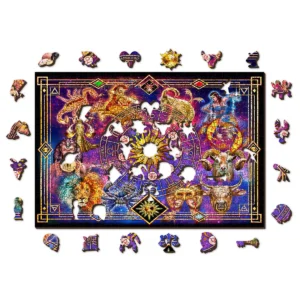Puzzle-ul din lemn Montaj zodiac prezintă toate semnele zodiacului pe un fundal cosmic uimitor. Montajul zodiacal prezintă o compoziție uimitoare plină de nuanțe colorate.