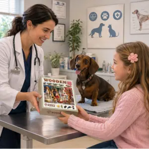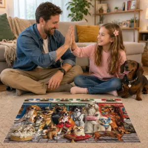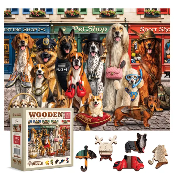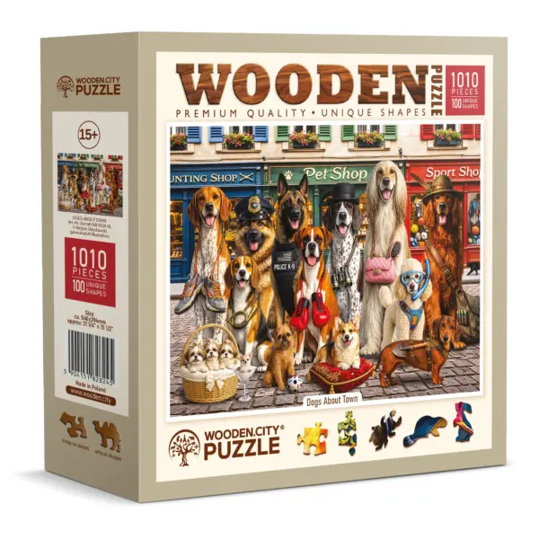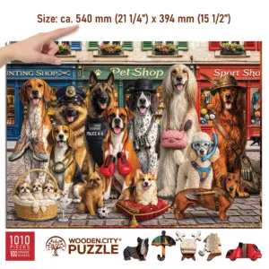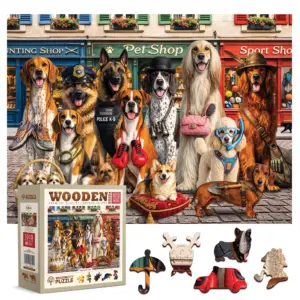 Veselie, caracter și un strop de umor – puzzle-ul din lemn Câini în oraș este o piesă cu adevărat unică, care îți va aduce garantat un zâmbet pe față încă de la primul moment. Acest puzzle special nu va emoționa doar inimile iubitorilor de câini, ci pe ale tuturor celor care apreciază o lume vizuală plină de viață, detaliată și jucăușă.