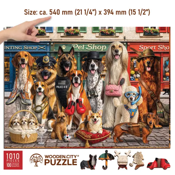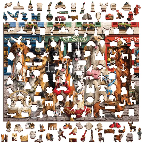 Una dintre cele mai mari particularități ale puzzle-ului Câini în oraș este multitudinea de elemente tăiate în forme unice. Pe lângă piesele clasice de puzzle, vei găsi și elemente speciale „whimsy”, care iau forme legate de câini, viața urbană și diverse obiecte.