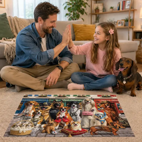 Asamblarea puzzle-ului este o modalitate excelentă de relaxare, dar Câini în oraș oferă mai mult decât atât: și veselie. Câinii cu personalitate și detaliile amuzante ajută la relaxare, dezvoltând în același timp concentrarea și răbdarea.