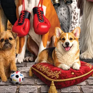 Scena înfățișează o stradă aglomerată dintr-un orășel, unde protagoniștii sunt, bineînțeles, câinii. Diferite rase se aliniază una lângă alta, fiecare cu propriul stil și personalitate: personaje elegante, sportive, îndrăznețe sau chiar excentrice, care par să se pregătească pentru o prezentare de modă sau un eveniment special. Detaliile mici – accesoriile, hainele și expresiile faciale – fac această imagine cu adevărat vie și adorabilă.