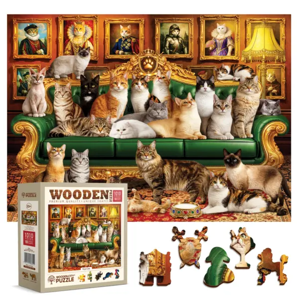 Pășește într-o lume elegantă, aristocratică, unde pisicile domnesc! Puzzle-ul din lemn Pisici Regale este un puzzle artistic, cu o atmosferă specială, care îmbină eleganța picturilor clasice cu natura fermecătoare și jucăușă a pisicilor. Această imagine unică, bogată în detalii, te transportă într-un salon opulent, unde pisicile care tronează pe canapea formează o adevărată curte regală.