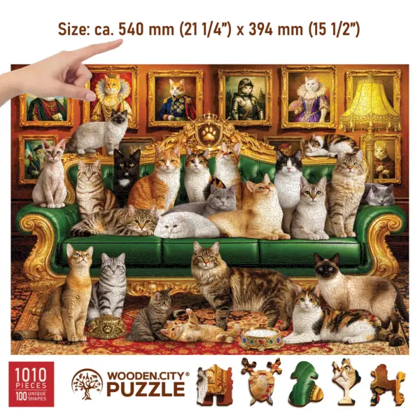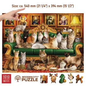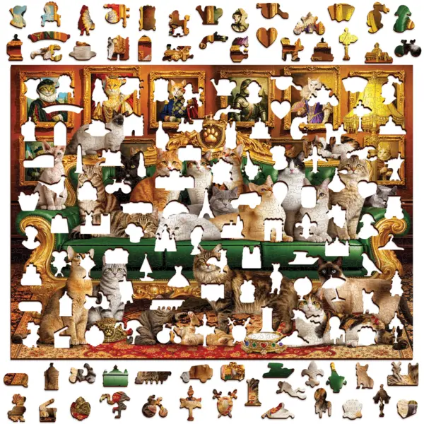 Lumea vizuală a puzzle-ului din lemn Pisici Regale este în același timp clasică și distractivă. Ramele aurii bogat decorate, canapeaua de catifea și „portretele nobiliare” din fundal evocă atmosfera aristocratică a vremurilor vechi – cu o mică întorsătură. Pe tablouri și pe canapea nu apar oameni, ci pisici, ca și cum ar fi membri ai unei familii regale.